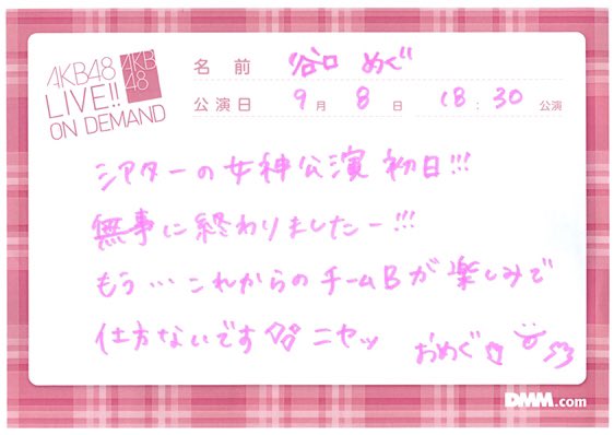 “ขอบคุณค่ะ ทาคาฮาชิ จูริซัง ทีม B (ผู้ชมหัวเราะ) โอเมกุ ทานิกุจิ เมกุ ค่ะ ขอบคุณค่ะ ฉันเองตั้งแต่ได้ขึ้นทีม ก็อยู่ทีม A มาตลอดจนถึงตอนนี้ โดยครั้งนี้ได้ยืนบนสเตจในฐานะเมมเบอร์ทีม B เป็นครั้งแรก ช่วงที่เปิดม่านตอน Opening ที่นั่งผู้ชมเต็มไปด้วยแท่งไฟสีน้ำเงินล่ะ ฉันเพิ่งเคยเห็นภาพที่เต็มไปด้วยแท่งไฟสีน้ำเงินเป็นครั้งแรกก็เลยรู้สึกว่าประทับใจขึ้น รู้สึกขึ้นมาอย่างจังเลยว่า อา~ ทีม B ต่อจากนี้น่าสนุกจัง สำหรับในทีม B ตั้งใจว่าจะลุยด้านน่ารักให้เต็มที่ค่ะ เพราะงั้นช่วยชมกันด้วยนะคะ ฝากด้วยค่ะ”