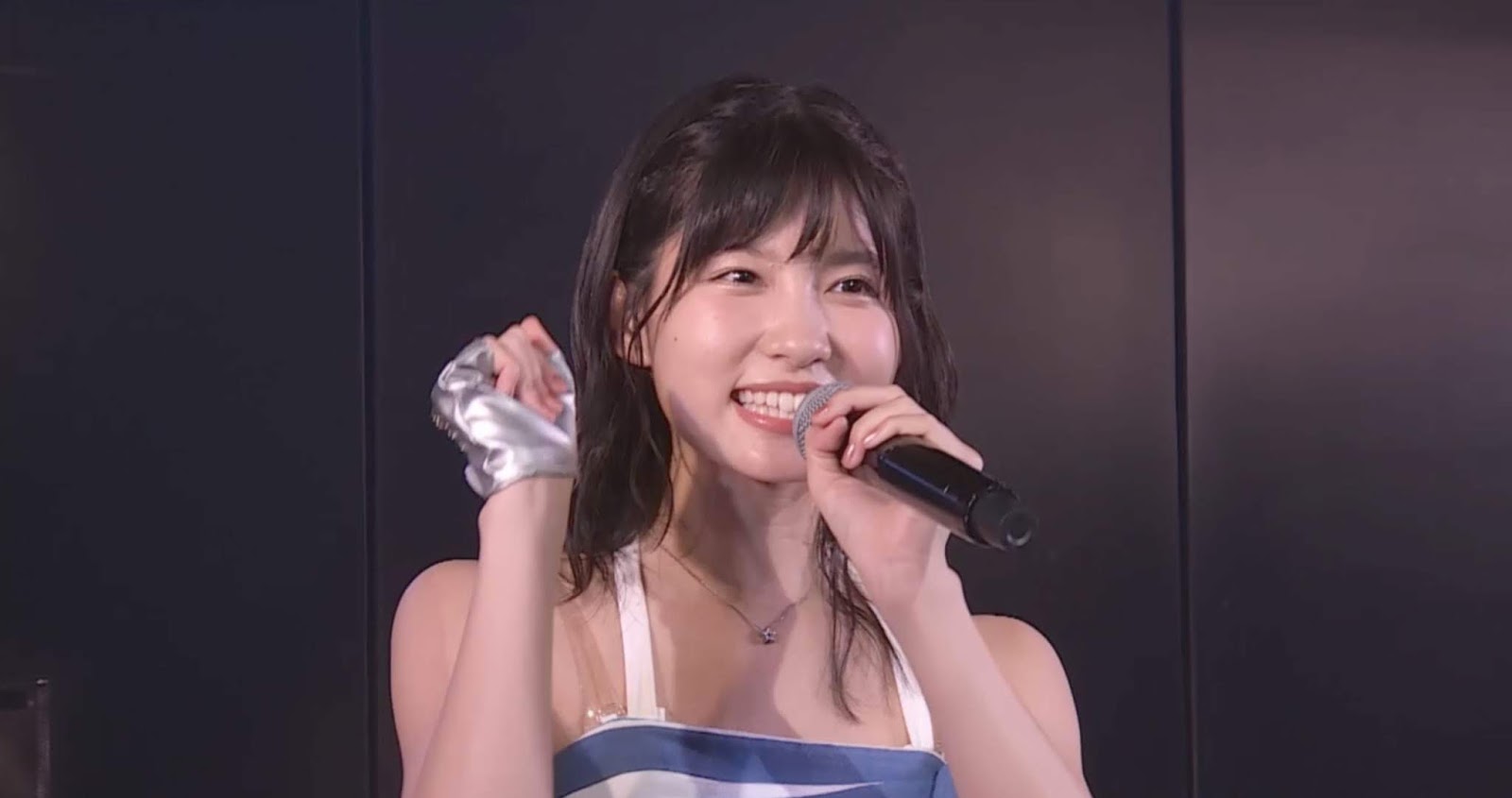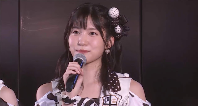 「ありがとうございます。高橋朱里さんチームB (客: 笑い) のおめぐこと谷口めぐです。ありがとうございます。私も昇格してから今までずっとチームAで。今回は初めてチームBのメンバーとして公演に立たせていただくんですけど、オープニングの幕開いた瞬間、客席が青いペンライトでいっぱいで、私、青いペンライトでいっぱいの景色初めて見て、それで凄く感動してしまって、あー、これからのチームBも楽しみだなってすごい感じました。チームBでは可愛いを極めていきたいなって思いますので、是非見ててください。よろしくお願いします!」