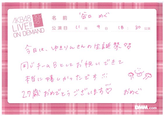 โอเมกุ: ซ้อมเพื่อการแสดงรอบแรกของทีม B ตั้งมากมาย แล้วเพราะยูกิรินซังเป็นออริเมมก็เลยช่วยสอนให้ตั้งเยอะ แต่หลังจบ Opening ของสเตจวันแรก ยูกิรินซังกับโอยะซังก็คุยที่ห้องแต่งตัวว่าปวดเอวเนอะ หลังจากนั้นก็คุยกันว่าเป็นสเตจที่ทำให้ปวดเอวเนอะ ก็เลยคิดว่าเริ่มมีอายุแล้วรึเปล่านะ…
